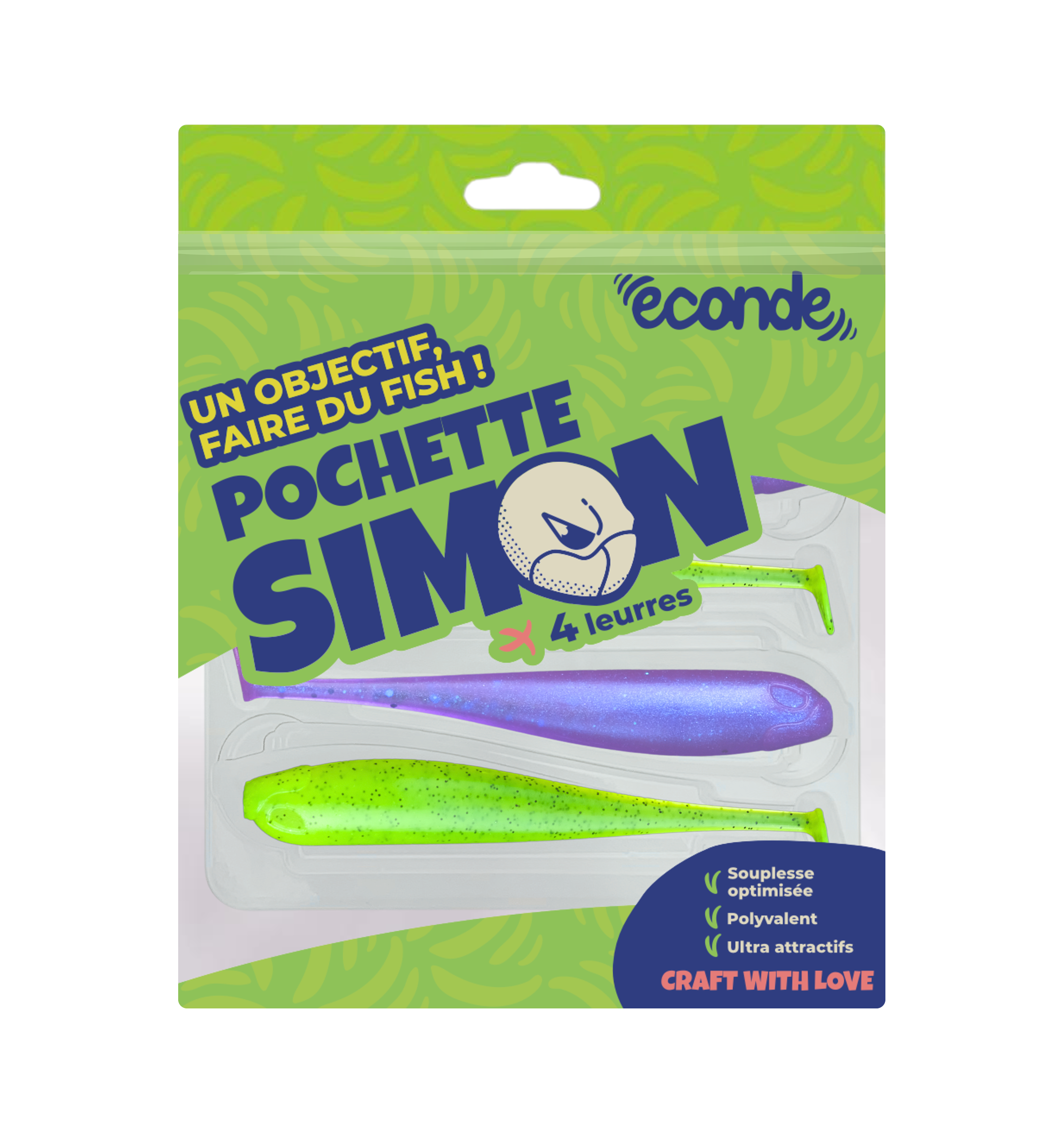 La pochette contient 4 leurres Simon communs répartis en 2 coloris visibles.